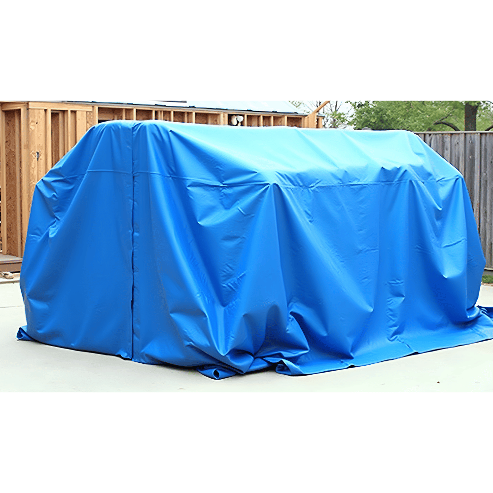 Protects materials by covering them against adverse weather conditions such as sun, snow, rain, and dust.